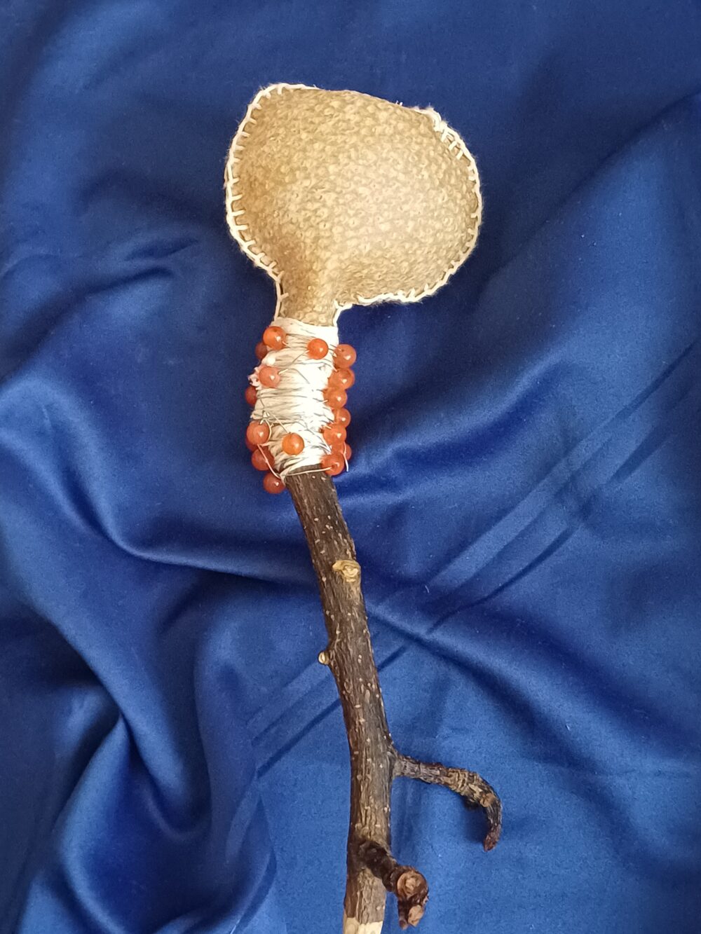 Wildschweinhaut, Birnbaum, Baumwollschnur, Karneol und Mais